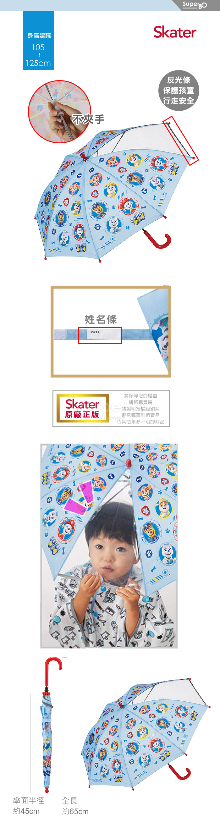 ◆適合身高105-125公分 ◆單面透明設計,搭配反光條,保護孩童行走安全。 ◆於收合黏貼處特別設計姓名條,讓孩童容易分辨。 ◆安全開關,上推、下收合,不夾傷小手。 ◆玻璃纖維骨架,輕量又耐用。 材質:聚酯纖維、聚乙烯、玻璃纖維 傘面半徑:45cm 傘長:65cm 產地:中國 注意事項 此為小小朋友用的雨傘,請確認身高105-125公分後再做購買 1.使用後請於通風處陰乾。 2.請遠離高溫及火源。 3.請在成人看照下使用。