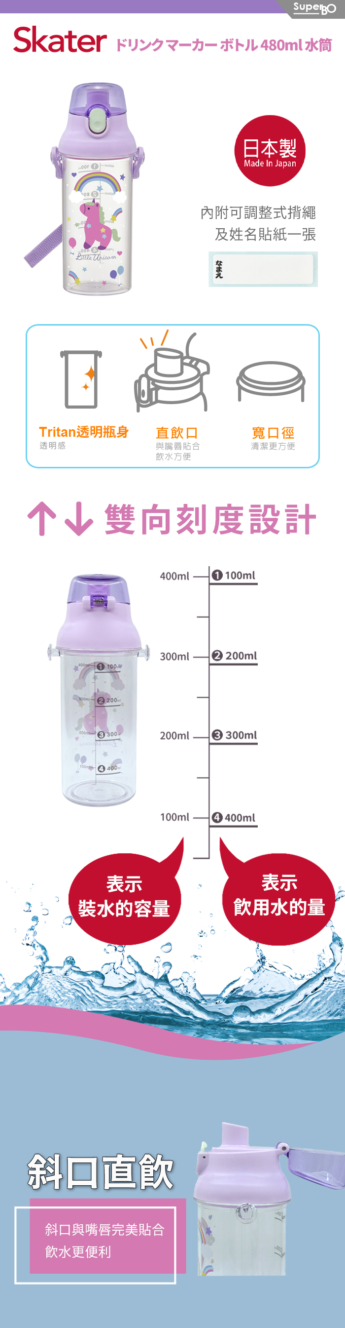 ◆含有水量刻度的透明瓶身,方便查看瓶內水量,彈蓋式開口設計。