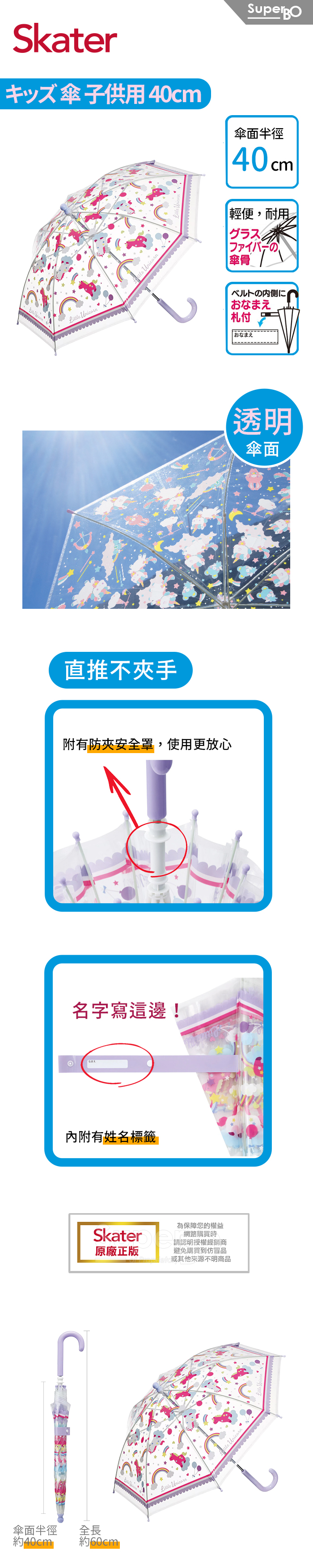 ◆適合身高95-105公分 ◆傘面透明設計,搭配反光條,保護孩童行走安全。 ◆於收合黏貼處特別設計姓名條,讓孩童容易分辨。 ◆安全開關,上推、下收合,不夾傷小手。 ◆玻璃纖維骨架,輕量又耐用。 材質:聚酯纖維、聚乙烯、玻璃纖維 傘面半徑:40cm 傘長:60cm 產地:中國 注意事項 此為小小朋友用的雨傘,請確認身高95-105公分後再做購買 1.使用後請於通風處陰乾。 2.請遠離高溫及火源。 3.請在成人看照下使用。