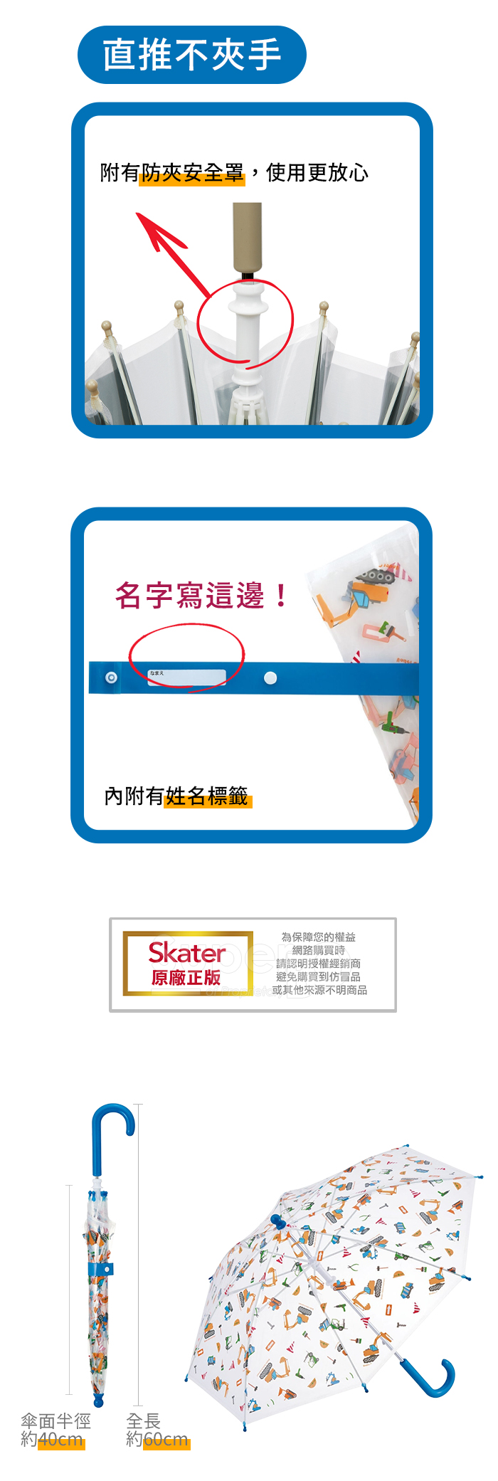 ◆傘面透明設計,搭配反光條,保護孩童行走安全。