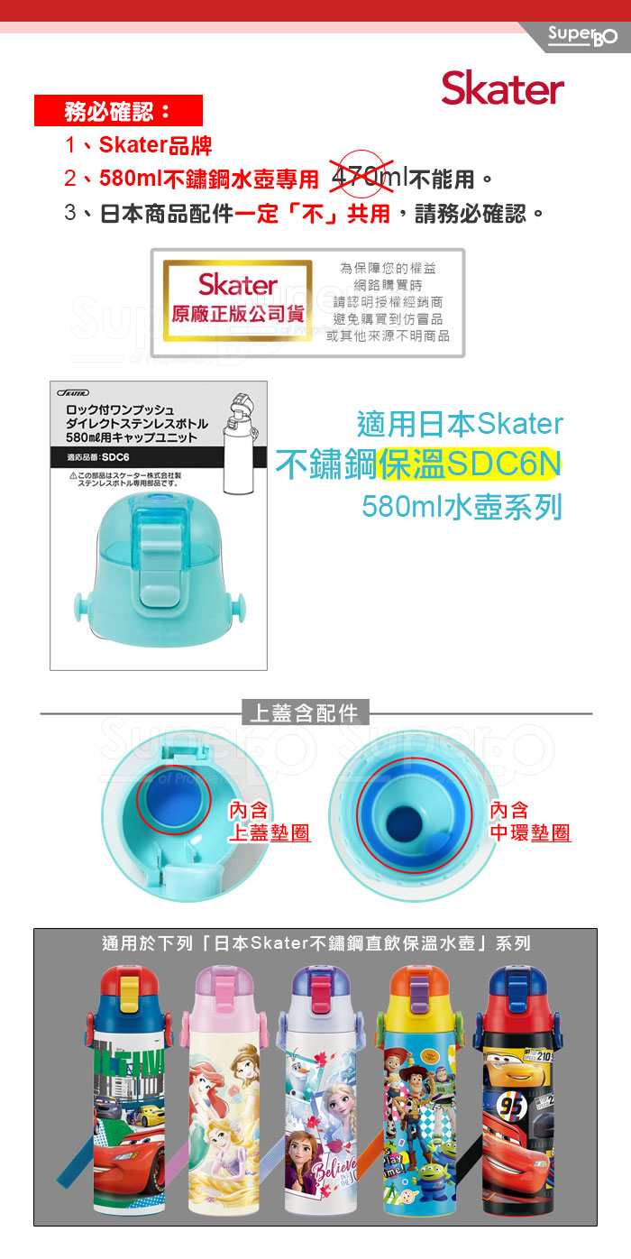 ◆Skater不鏽鋼(580ml)直飲保溫水壺 專用上蓋 ◆內含墊圈 ◆只適用於型號SDC6N,此品不適用於其他水壺,請確認所需。 材質:矽膠、PP 、ABS 耐溫:上帽/70度、中環/120度、墊圈/140度 注意事項: ● 請以海綿清洗.勿用鋼刷或硬質物洗滌.以免刮傷。 ● 此品為原裝進口,若拆封後無法復原,請確認所需後再請購買