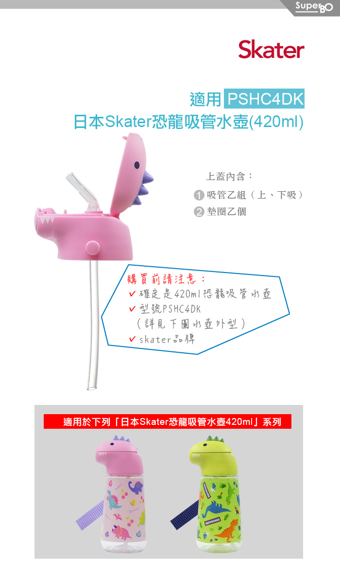 ◆Skater 恐龍吸管水壺(420ml) 專用配件 ◆只適用於型號PSHC4DK,此品不適用於其他水壺,請確認所需。 ◆請特別注意,與其他款式皆不共用。 材 質:上蓋 聚丙烯PP/耐熱溫度:120度 吸管、墊圈 矽膠 /耐熱溫度:140度 保存方式:置於乾燥處 產 地:中國 注意事項: 1.請注意: 只適用於Skater 恐龍吸管水壺(420ml)系列。 2.請以海綿清洗,勿用鋼刷或硬質物洗滌,以免刮傷。 *不適用於Skater其他系列水杯/壺*